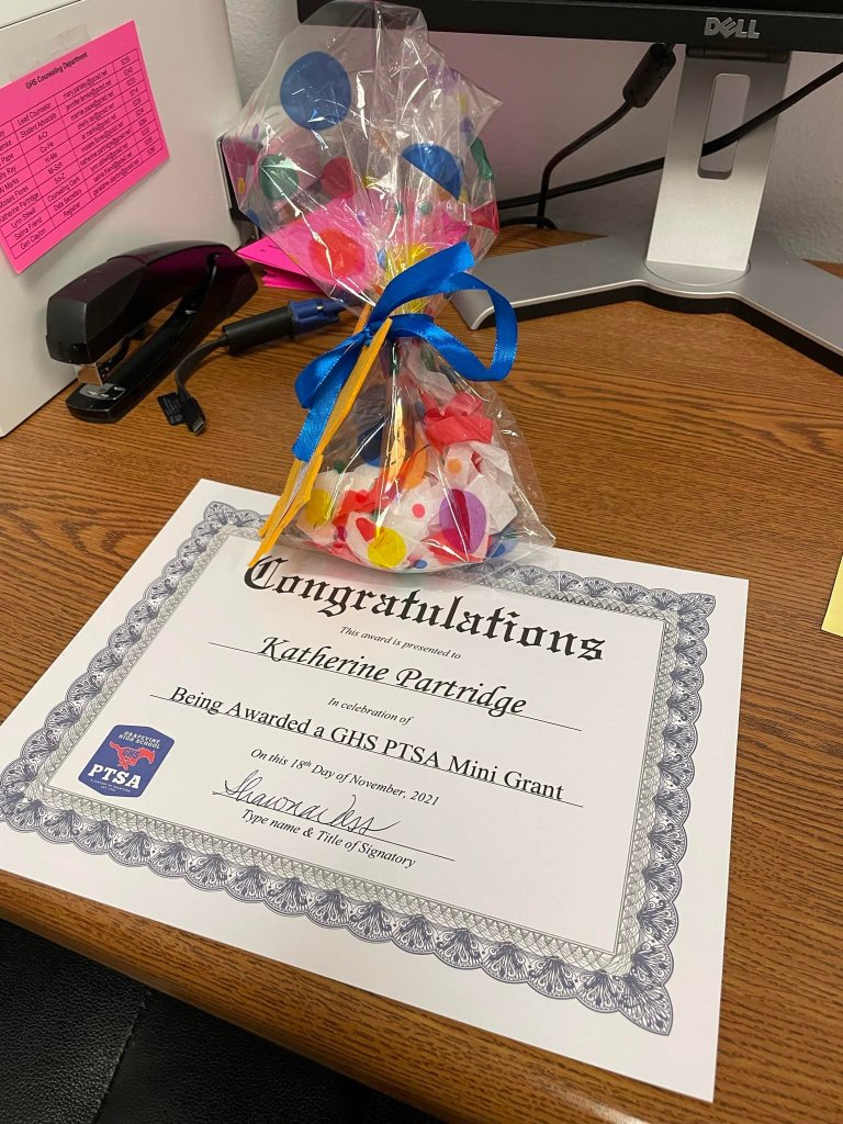 2022 GHS PTSA teacher grants included metronomes for band, decimal balance for science, knives for culinary, Bluetooth speakers for theatre, tuners for band, LED light strips for CTE, loaner charges for science, Tabletop ice maker for science, calculators for science, drunk Buster goggles for science, gold melting furnace for science, pantry shelf and a credit card reader for Transition SPED. Join GHS PTSA today!