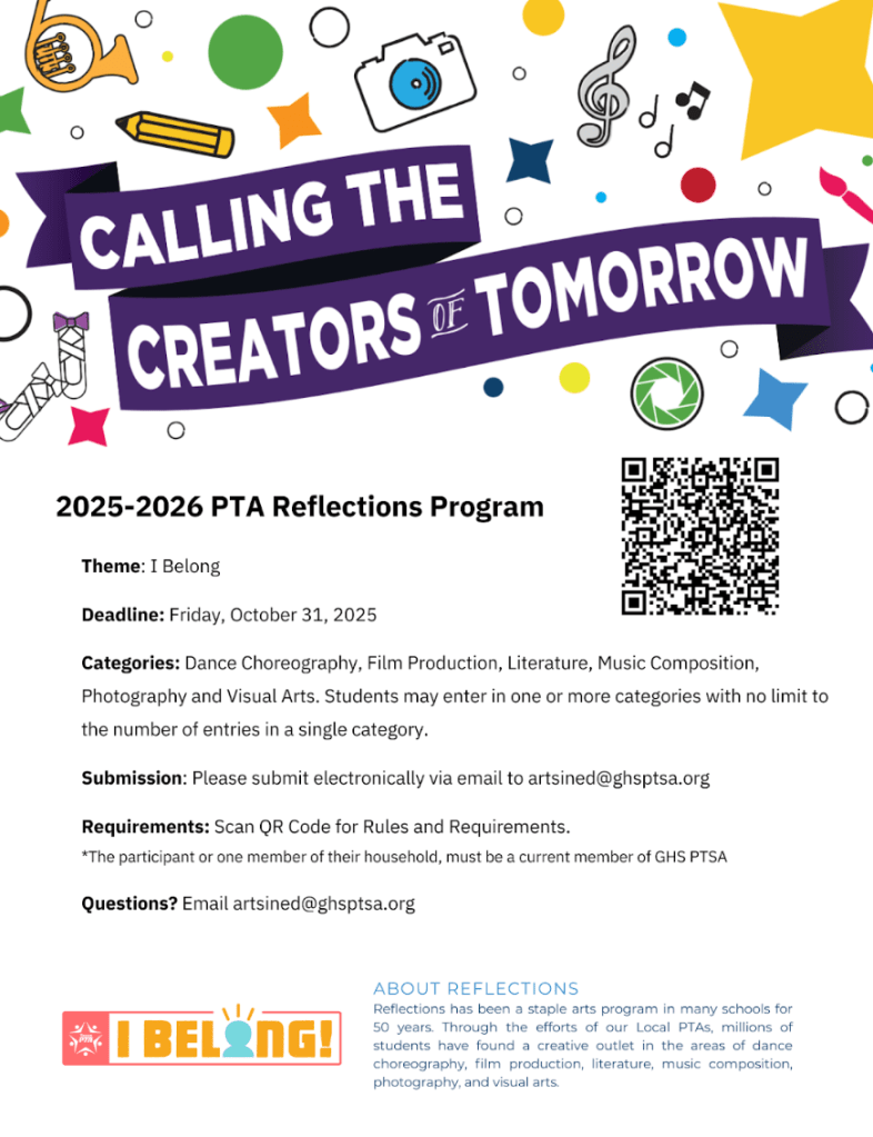 At GHS, our PTSA proudly supports this enriching opportunity by participating in both the state and national levels of the Reflections program. Students are invited to submit original works in one or more of the following categories: